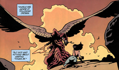 John and Angie then went globe-trotting to find out more about The Shadow Dog; during their travels Angie was able to access Eden, where she was given a mysterious branch by an angel. At the end of their trip, and with the vital information to hand, the pair finally consummated their relationship. (Hellblazer issue 184-183, 2003)