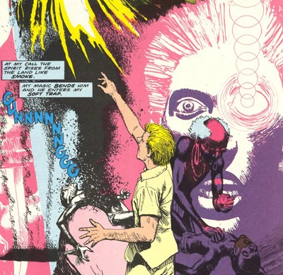 Constantine flies to Africa, where he meets a witch doctor who calls him 'The Laughing Magician' and says that he has been expecting him. As the witch doctor's power is tied to Sudan he cannot help Constantine directly, but instead allows him to see a vision of the binding process that was performed on a luckless child to save the entire village. The boy was left in a barren place so that the spirit would consume him and itself, but he was found and sold into slavery.