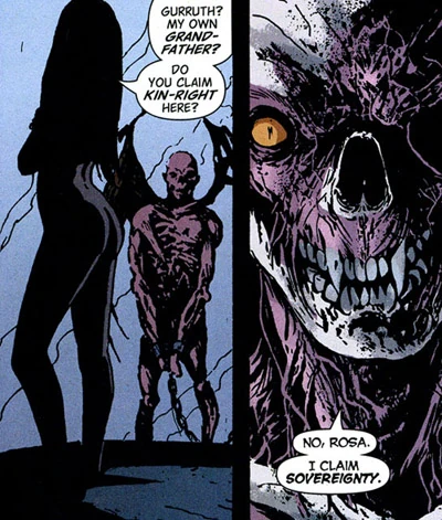 Nergal proved to be a tenacious sort, however, and slowly regrew his demonic form. But upon returning to his throne years later he discovered that his daughter, Rosacarnis, had stolen his throne and left his brother, the impervious Sterocax, unconscious in a pool of poison. Nergal tried to reclaim his lands but his daughter refused to believe he was truly back and had him cut to pieces once more. He regrew a new, smaller body - that of a rat - and fled to Earth. (Hellblazer issue 209-210, 2005)